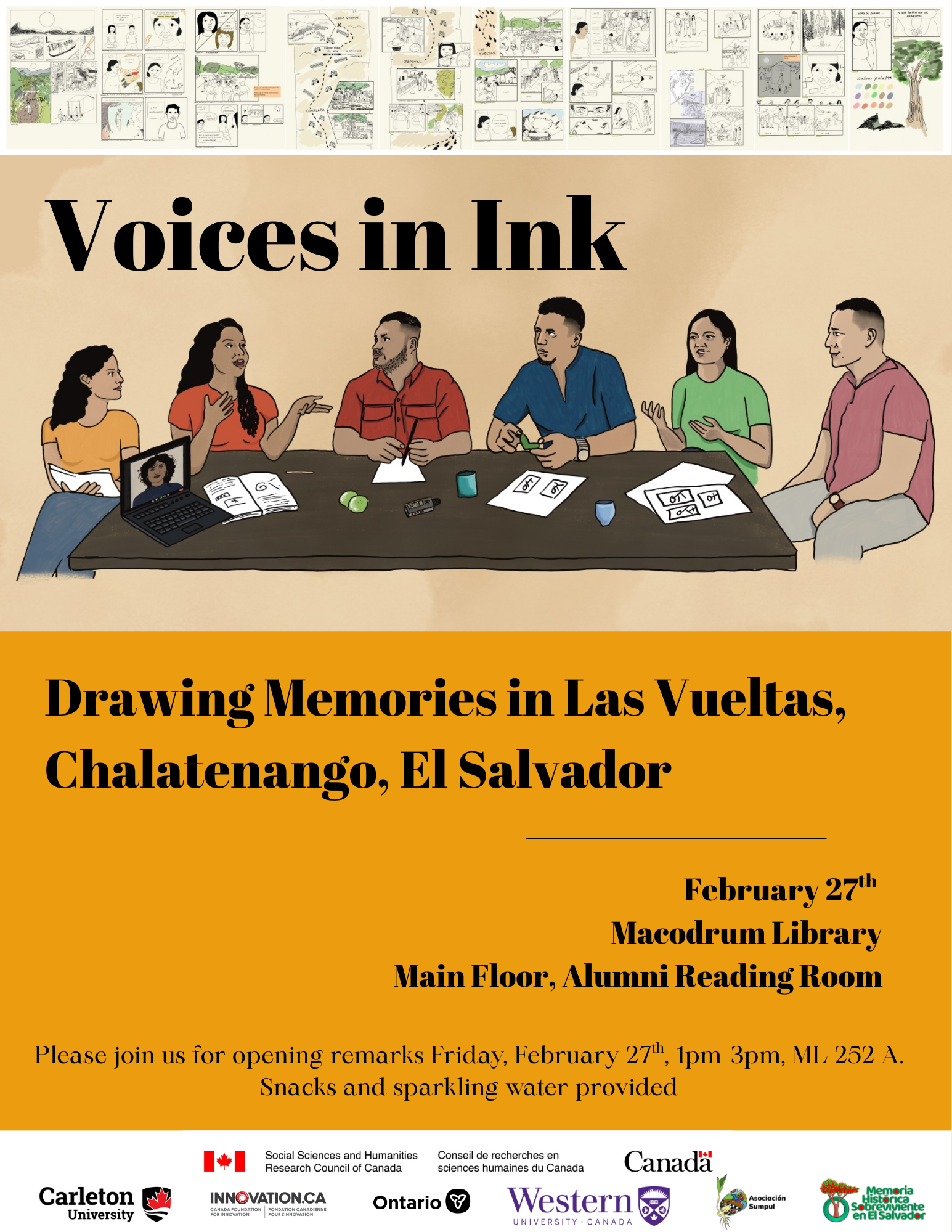La inauguración reunió a personal académico y estudiantil de la Universidad Carleton. En un panel conformado por , la profesora Beatriz Juárez-Rodríguez, laprofesora Marie-Ève Carrier-Moisan (Co-Directora del Departamento de Antropología) y la ilustradora Jessica Larios, se dialogó sobre la etnografía colaborativa, las metodologías participativas y decoloniales, y el papel de la narración visual en la preservación de la memoria y en el fortalecimiento de conversaciones intergeneracionales sobre la justicia en El Salvador.
